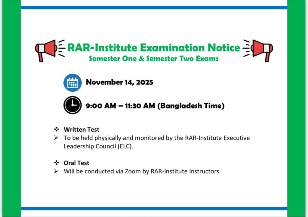 📢 RAR–Institute: Official Announcement of Examination Results for Semester One 🧾 We are pleased to announce that the examination results for Semester One of the ongoing RAR–Institute’s Two-Year Research Diploma Program have been officially released. This milestone reflects the dedication, discipline, and academic progress of our students. Their commitment to learning, even under challenging circumstances, […]