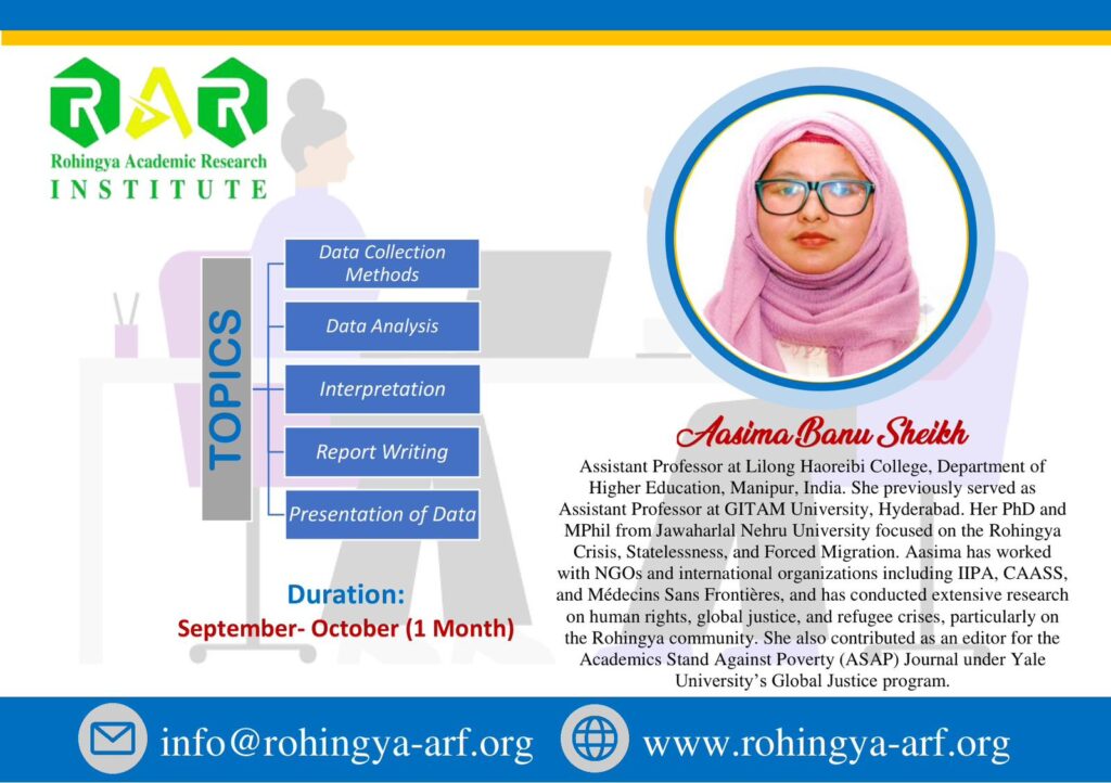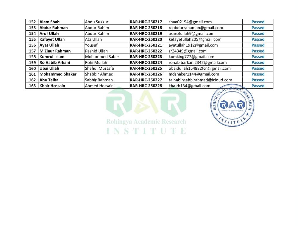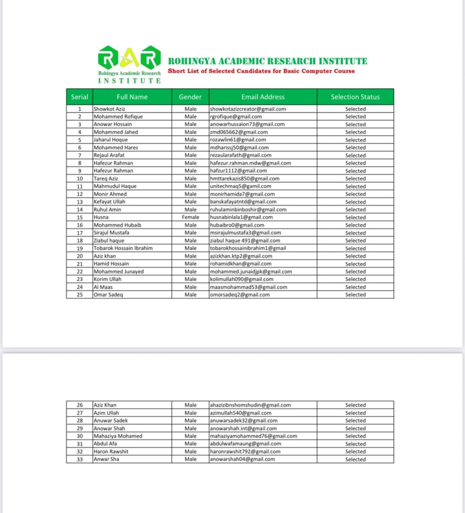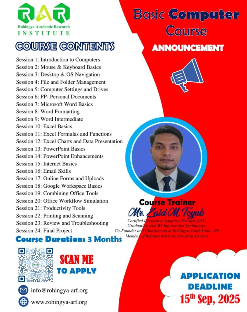 📢 𝐎𝐟𝐟𝐢𝐜𝐢𝐚𝐥 𝐀𝐧𝐧𝐨𝐮𝐧𝐜𝐞𝐦𝐞𝐧𝐭 – 𝐒𝐡𝐨𝐫𝐭𝐥𝐢𝐬𝐭 𝐨𝐟 𝐒𝐞𝐥𝐞𝐜𝐭𝐞𝐝 𝐂𝐚𝐧𝐝𝐢𝐝𝐚𝐭𝐞𝐬. The Rohingya Academic Research Institute (RAR-Institute) is pleased to share the 𝐒𝐡𝐨𝐫𝐭𝐥𝐢𝐬𝐭 𝐨𝐟 𝐒𝐞𝐥𝐞𝐜𝐭𝐞𝐝 𝐂𝐚𝐧𝐝𝐢𝐝𝐚𝐭𝐞𝐬 𝐟𝐨𝐫 𝐭𝐡𝐞 𝐁𝐚𝐬𝐢𝐜 𝐂𝐨𝐦𝐩𝐮𝐭𝐞𝐫 𝐂𝐨𝐮𝐫𝐬𝐞 (2025). We received a high number of applications and, after a careful review process, the most eligible and motivated candidates have been shortlisted to participate in this […]